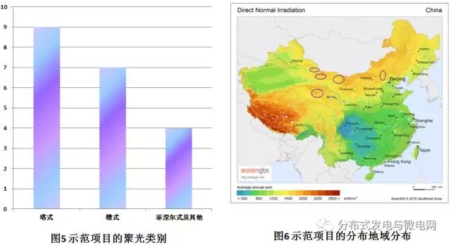 “十二五”發(fā)展落實(shí)情況:截至2015年底,全國已建成實(shí)驗(yàn)示范性太陽能熱發(fā)電站(系統(tǒng))6座,裝機(jī)規(guī)模為1.388萬千瓦;2016年9月,國家能源局印發(fā)《關(guān)于建設(shè)太陽能熱發(fā)電示范項(xiàng)目的通知》(國能新能[2016]223號),確定第一批20個(gè)太陽能熱發(fā)電示范項(xiàng)目,其中包括9個(gè)塔式電站,7個(gè)槽式電站和4個(gè)菲涅爾電站,總計(jì)裝機(jī)容量134.9萬千瓦,分布見圖5。項(xiàng)目主要分布在青海省、甘肅省、河北省、內(nèi)蒙古自治區(qū)、新疆自治區(qū)五個(gè)省區(qū),其中以甘肅項(xiàng)目數(shù)最多,分布見圖6。