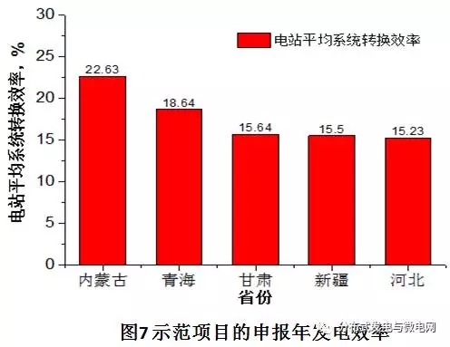 圖6和圖7顯示了示范項(xiàng)目的地點(diǎn)、太陽能DNI和效率情況。示范項(xiàng)目全部分布在我國北方地區(qū)。除了張家口市外,在甘肅,青海,內(nèi)蒙古和新疆等西北地區(qū)。從圖6可見,建站地點(diǎn)的年DNI值基本在2000kWh/m2左右,沒有超過2200kWh/m2的。圖7可見示范項(xiàng)目的效率分布在15-22%之間。