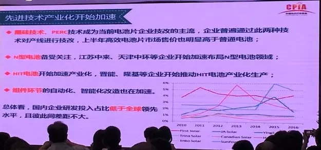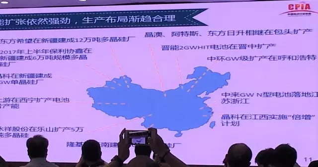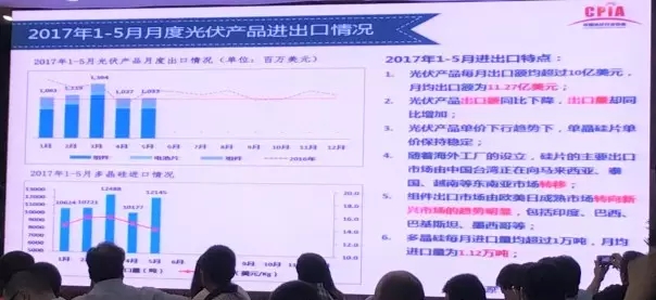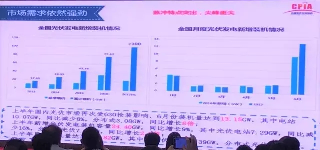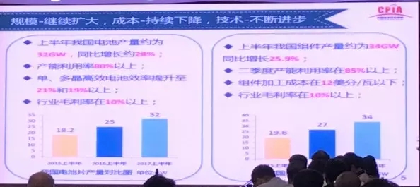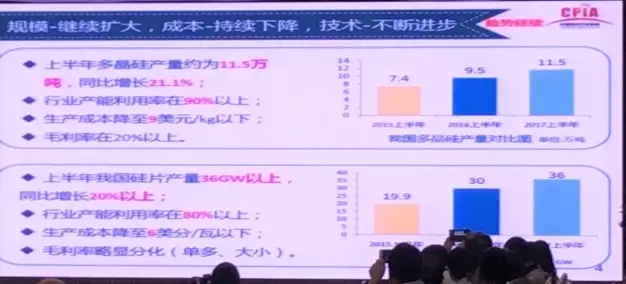 會上,中國光伏行業(yè)協(xié)會王勃華秘書長指出,回顧2017年上半年,在我國光伏市場快速增長的拉動下,企業(yè)產(chǎn)能利用率高企,市場呈現(xiàn)階段性供不應(yīng)求的局面。我國光伏產(chǎn)業(yè)呈現(xiàn)規(guī)模增速快、產(chǎn)能布局優(yōu)、應(yīng)用市場活、產(chǎn)業(yè)化水平高的特點。上半年多晶硅產(chǎn)量約11.5萬噸,同比增長21.1%;行業(yè)產(chǎn)能利用率在90%以上;生產(chǎn)成本降至9美元/kg以下;毛利率在20%以上。上半年我國硅片產(chǎn)量36GW以上,同比增長20%以上;行業(yè)產(chǎn)能利用率在80%以上;生產(chǎn)成本降至6美分/瓦以下;毛利率略顯分化??傊?,產(chǎn)業(yè)規(guī)模持續(xù)擴大,成本持續(xù)下降,技術(shù)不斷進步。