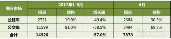 年初要求重新申報(bào)公告,產(chǎn)生的直接結(jié)果是:2017年1-6月份新能源市場僅銷售計(jì)14320輛,同比增長為-57.0%。2017年的上半年,與2016年沒有辦法比。2017年結(jié)構(gòu)列表如下: