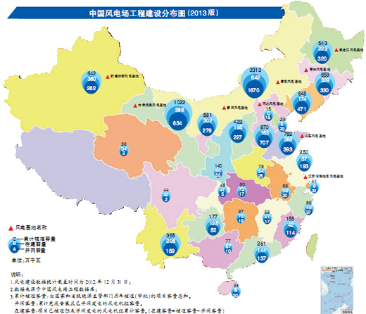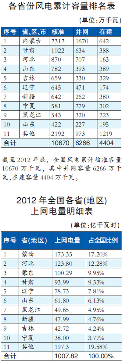 至2012年底,全國累計風電吊裝容量7021萬千瓦,累計建設(shè)容量6525萬千瓦,累計并網(wǎng)容量6266萬千瓦。全國共有14個省(區(qū))風電累計并網(wǎng)容量超過百萬千瓦,其中內(nèi)蒙古并網(wǎng)容量1670萬千瓦,居全國之首,河北和甘肅分別以并網(wǎng)707萬千瓦和634萬千瓦位居第二、三位。華北、東北、西北地區(qū)風電并網(wǎng)容量約占全國風電并網(wǎng)容量的86%。