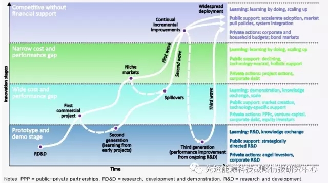 創(chuàng)新必須在從早期研究到全面示范和部署的各個階段均得到支持。向新的能源系統(tǒng)轉(zhuǎn)型需要漸進和激進的創(chuàng)新。在創(chuàng)新的所有階段,如從基礎和應用研究到開發(fā)、示范和部署階段,各國政府的長期支持均非常重要。將資源分配給各種技術必須考慮創(chuàng)新的短期和長期機遇及挑戰(zhàn),同時反映技術成熟度。