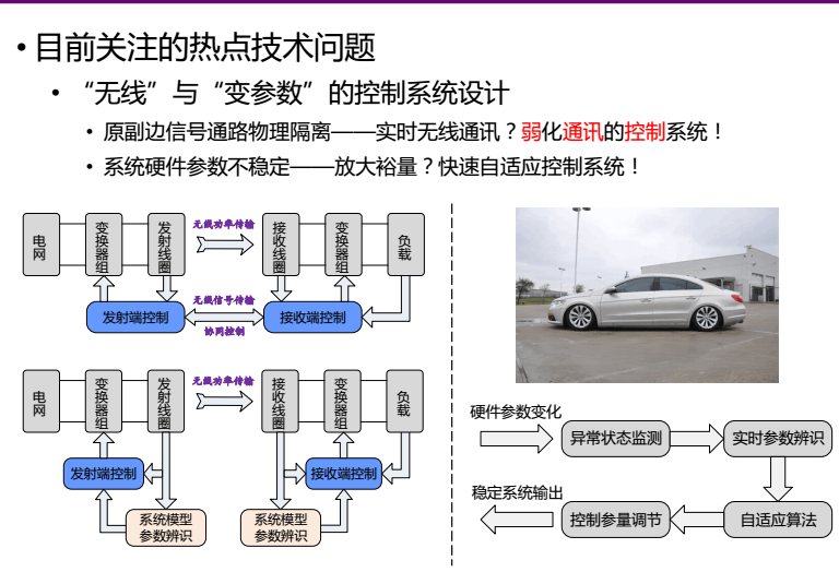 無(wú)線傳輸并不是簡(jiǎn)單的電路問(wèn)題,而是關(guān)于電磁場(chǎng)的問(wèn)題。目前基于場(chǎng)的模型,包括基于能量流的模型正在進(jìn)行之中,還不是很成熟。真正的無(wú)線傳輸不是眼前的近場(chǎng)問(wèn)題,更重要的是遠(yuǎn)場(chǎng)問(wèn)題。目前近場(chǎng)無(wú)線充電技術(shù)方面主要面臨三個(gè)難題,一是控制問(wèn)題,原副邊信號(hào)物理隔離進(jìn)行實(shí)時(shí)無(wú)線通訊,需要弱化通訊的控制系統(tǒng);另外隨著外部條件的變化,系統(tǒng)參數(shù)非常敏感地變化,致使傳輸功率、效率也會(huì)發(fā)生較大變化,而這些都屬于“無(wú)線”與“參數(shù)”的控制問(wèn)題。