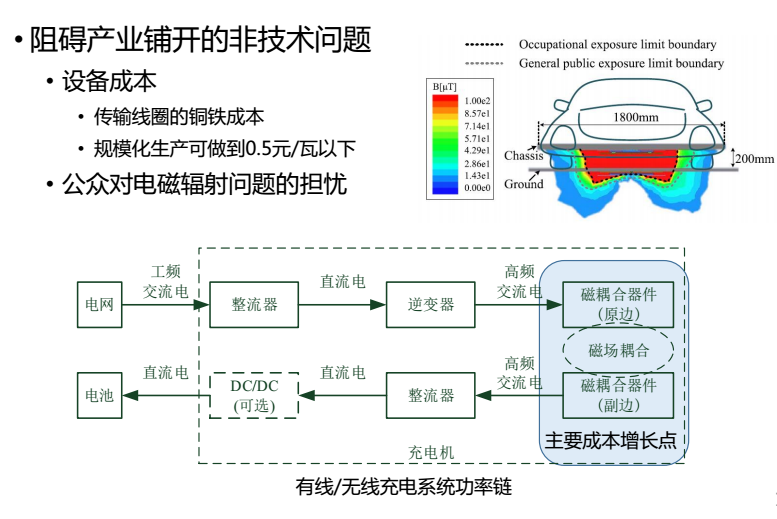 上面所講都是一些技術(shù)問(wèn)題,但它們現(xiàn)在已經(jīng)不是不可克服的瓶頸問(wèn)題了,目前最大的問(wèn)題應(yīng)該是非技術(shù)的問(wèn)題。阻礙產(chǎn)業(yè)鋪開(kāi)的非技術(shù)問(wèn)題主要有三種,一是缺乏統(tǒng)一的標(biāo)準(zhǔn),目前對(duì)無(wú)線電的傳輸還沒(méi)有一個(gè)統(tǒng)一的標(biāo)準(zhǔn),然而技術(shù)標(biāo)準(zhǔn)化是無(wú)線電能傳輸技術(shù)在電動(dòng)汽車(chē)無(wú)線充電推廣應(yīng)用的必要條件;二是成本問(wèn)題,無(wú)線充電技術(shù)投入的成本仍高于有線充電成本,導(dǎo)致成本問(wèn)題制約發(fā)展;但隨著技術(shù)的進(jìn)步,規(guī)?;占昂竽軌蛴行У慕档统杀荆岣呤袌?chǎng)的競(jìng)爭(zhēng)力;三是公眾對(duì)電磁輻射問(wèn)題的擔(dān)憂,雖然在理論上,無(wú)線充電電磁輻射對(duì)人體沒(méi)有危害,消費(fèi)者對(duì)此仍有質(zhì)疑。