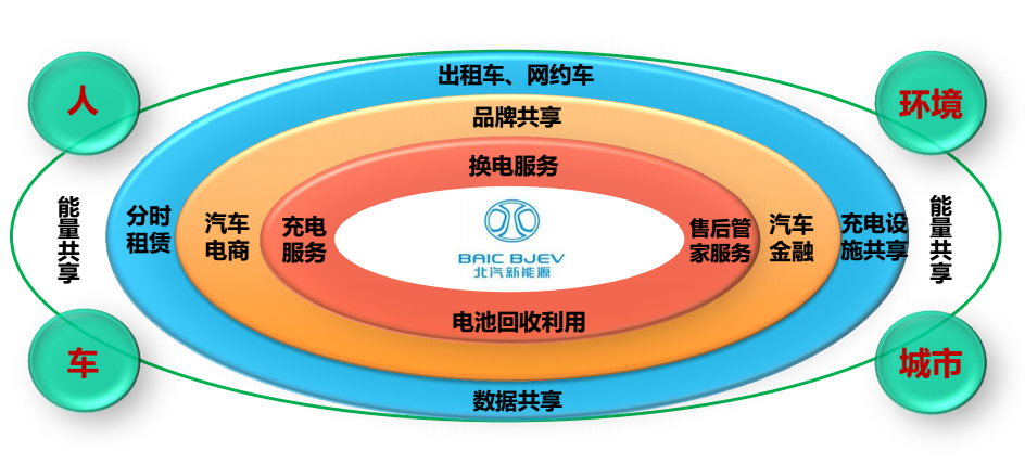這是北汽新能源對未來的一個(gè)愿景,起步時(shí)候大家都很簡單,都是做車的,但是車離不開你的駕駛者,還有你的乘客,所以是人,但是隨著發(fā)展,一定會(huì)和環(huán)境、和城市的基礎(chǔ)建設(shè)互動(dòng)。所以可能很簡單,就是整個(gè)生態(tài)圈,整個(gè)產(chǎn)品和零部件,包括換電服務(wù)、電池回收利用、充電服務(wù)、售后服務(wù),再往外就會(huì)涉及到生態(tài)圈的一個(gè)環(huán)節(jié),包括市場、汽車金融、品牌,再往外我們所關(guān)注的是出租車、網(wǎng)約車、充電的分時(shí)、汽車共享,再往外就是和城市環(huán)境中最大的,有了數(shù)據(jù)流,還有一個(gè)就是能量流,這樣我們就會(huì)把人、車、環(huán)境、城市有機(jī)的結(jié)合起來,這時(shí)候?qū)?huì)成為未來更大的生態(tài)圈,幫助整個(gè)社會(huì)、幫助整個(gè)城市更好的接受新能源的產(chǎn)品、應(yīng)用和推廣。