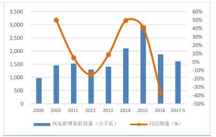 受到2016 年標桿電價下調(diào)影響,2015 年國內(nèi)風電行業(yè)搶裝明顯,當年實現(xiàn)新增裝機超30GW,同比增50%以上。而 2016 年國內(nèi)新增裝機不足 24GW,其中華北、華東地區(qū)風電新增裝機增長明顯,華東占比提升7 個百分點至 20%。而西北地區(qū)大幅下降 8 個百分點至 26%,體現(xiàn)了裝機區(qū)域向中東部和南部轉(zhuǎn)移的趨勢。