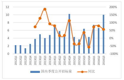 2016 年前三季度累計招標量為 24GW,較去年同期增長68%,創(chuàng)歷史新高。而對比 15年的搶裝現(xiàn)象,14 年同期的招標量僅為17.3GW,而14 年全年的招標量也僅為27.5GW,與今年相比明顯較弱。主要原因是區(qū)域電力企業(yè)及火電企業(yè)由于火電受限,同時風電成本下降投資回報率合理,轉(zhuǎn)型發(fā)展風電所致。
