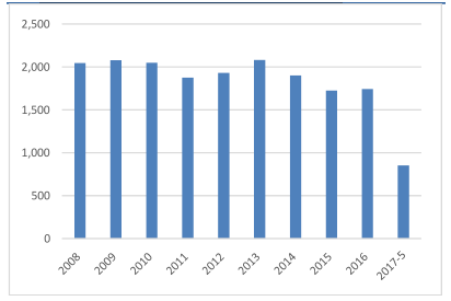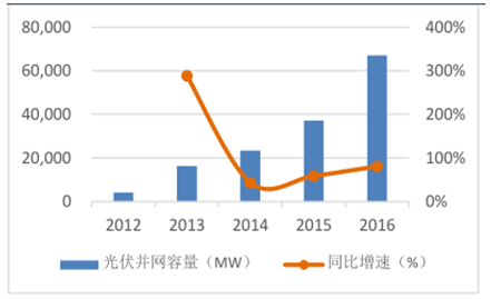 2016 年受“630”上網(wǎng)電價下調(diào)的影響,光伏迎來史上最強搶裝潮。新增裝機容量達34.54GW,同比增 128%,其中地面電站為 30.3GW,占比 87.7%,分布式電站分別為4.24GW,2016 年底全國累計裝機容量達77.42GW。由于補貼拖欠以及棄光因素的影響,運營商面臨比較大的現(xiàn)金流壓力,導致信貸擴張能力弱的民營企業(yè)的退出。