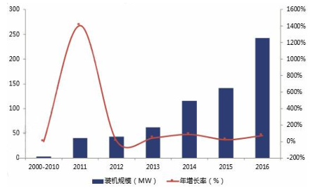 中國電化學儲能市場累計裝機規(guī)模(2000-2016 )