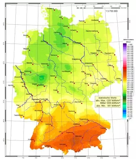 德國的日照條件并不好。年平均日照強(qiáng)度,最高的地區(qū)為1257千瓦時(shí)/平方米,最低的地區(qū)為951千瓦時(shí)/平方米,平均為1055千瓦時(shí)/平方米,比中國三類地區(qū)的平均日照強(qiáng)度還要低。下圖是德國的日照強(qiáng)度地圖: