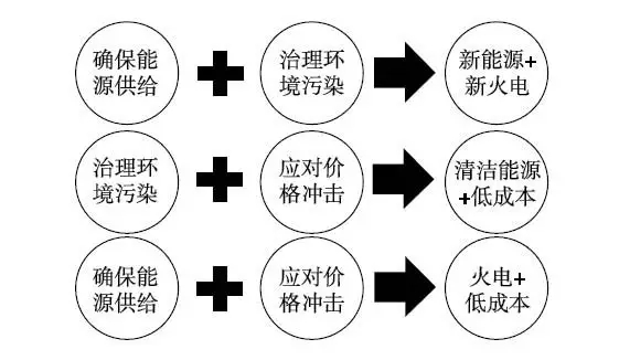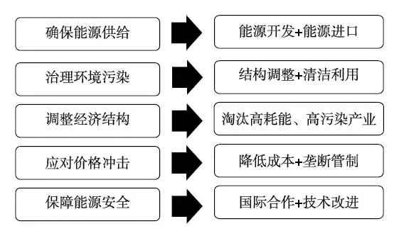 通過具體分析,筆者認(rèn)為能源革命目標(biāo)的先后順序依次為確保能源供給、治理環(huán)境污染、調(diào)整經(jīng)濟(jì)結(jié)構(gòu)、應(yīng)對(duì)價(jià)格沖擊、保障能源安全。