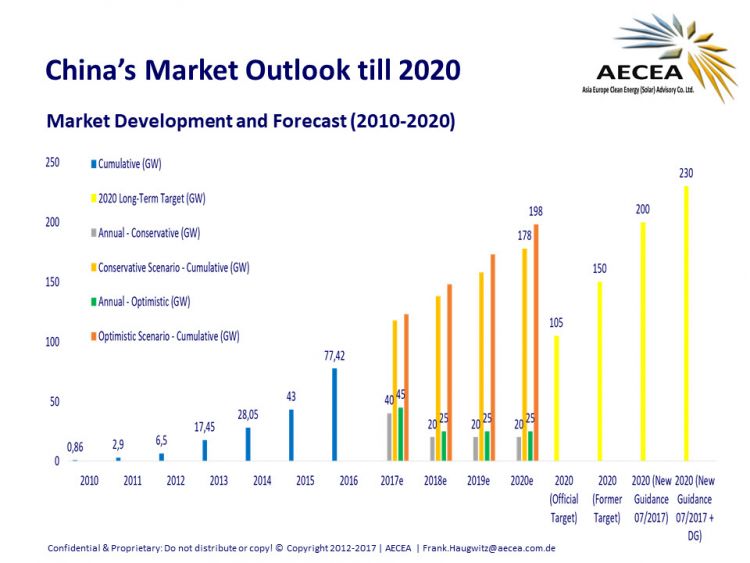 隨著7月份部署10.52吉瓦太陽能,AECEA提高了其2017年的預(yù)測(cè),預(yù)計(jì)到年底,中國可能有望新增40-45吉瓦的太陽能容量。這相當(dāng)于16%同比增長率,并且有望超過2016年創(chuàng)紀(jì)錄部署容量30%。