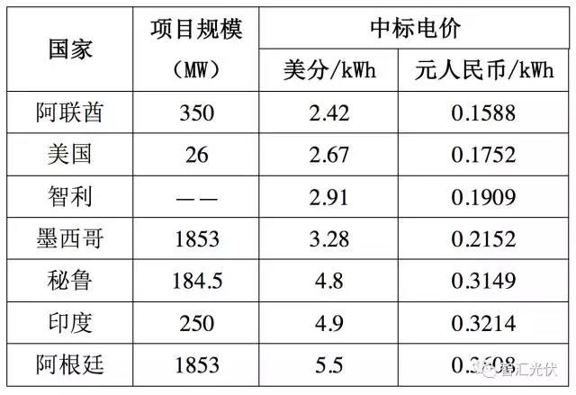 表:近期國際光伏項目的上網(wǎng)電價中標價格
