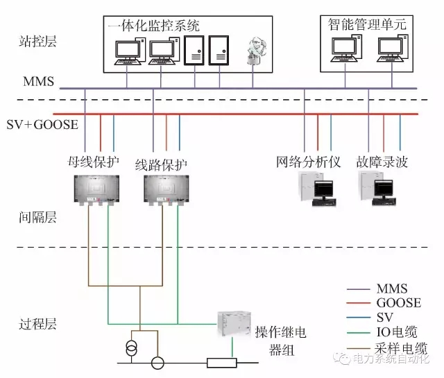 保護(hù)就地化變電站與當(dāng)前智能站都遵循IEC61850協(xié)議,均保持“三層兩網(wǎng)”的結(jié)構(gòu),但實(shí)現(xiàn)方式上發(fā)生了變革。首先,由于采用電纜直采直跳,取消了合并單元和智能終端,只需要操作繼電器組作為保護(hù)裝置與開關(guān)機(jī)構(gòu)的接口;而且間隔內(nèi)無網(wǎng)絡(luò),因而可取消過程層交換機(jī),只需在中心交換機(jī)增設(shè)端口即可,簡化了過程層設(shè)備。保護(hù)裝置具備SV和GOOSE輸出功能,供站域保護(hù)、故障錄波和網(wǎng)絡(luò)分析等設(shè)備使用。此外,就地化安裝模式要求設(shè)備取消液晶面板,因此需要增設(shè)智能管理單元,連接于站控層網(wǎng)絡(luò)。智能管理單元對站內(nèi)就地化保護(hù)設(shè)備進(jìn)行界面集中展示、備份管理、保護(hù)設(shè)備在線監(jiān)視與診斷等功能。智能管理單元與不同廠家的保護(hù)裝置之間可實(shí)現(xiàn)互聯(lián)互通,對各廠家保護(hù)裝置采用統(tǒng)一的顯示和操作界面。