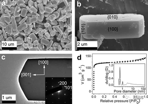 (a)高分散的Si-ZSM-5@GO晶體的SEM圖;(b)單個(gè)Si-ZSM-5@GO晶體的SEM圖;(c)Si-ZSM-5@GO沸石晶體的TEM圖和原位電子衍射圖,表明晶體沿c軸方向生長(zhǎng);(d)氬氣吸脫附曲線和孔徑分布圖