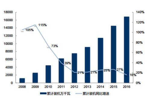 相比之下, 海上風(fēng)電增長(zhǎng)增速高于陸上風(fēng)電,成為未來(lái)風(fēng)電行業(yè)重要的增量。 事實(shí)上,伴隨著陸上風(fēng)電可開發(fā)的區(qū)域逐漸減少,而海上風(fēng)電資源豐富,且沿海地區(qū)經(jīng)濟(jì)發(fā)達(dá),電網(wǎng)容量更大,風(fēng)電接入條件更好,近年來(lái)風(fēng)電行業(yè)逐漸由陸上向近海發(fā)展。 2001 年-2015年全球海上風(fēng)電累計(jì)裝機(jī)容量復(fù)合增長(zhǎng)率 43.51%,2015年累計(jì)裝機(jī)容量 12167MW。2016 年全球海上風(fēng)電市場(chǎng)新增裝機(jī)容量 2217MW,同比下滑 36%。 截止 2016 年底,全球海上風(fēng)電累計(jì)裝機(jī)容量達(dá)到 14384MW。