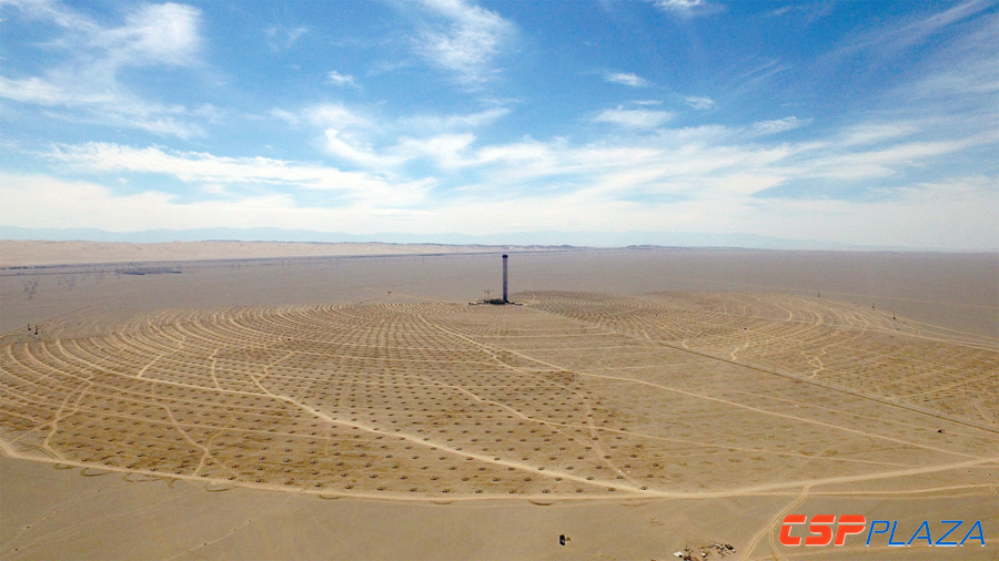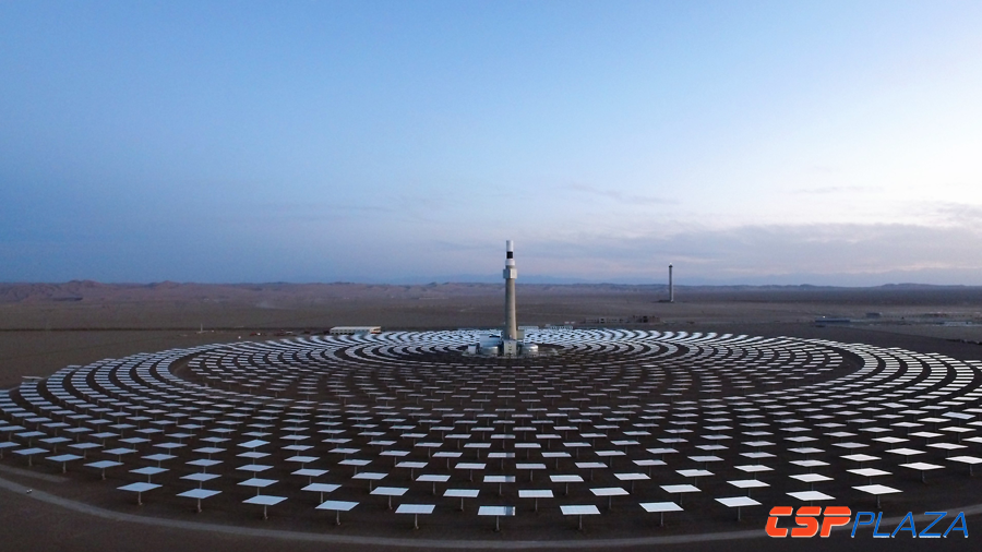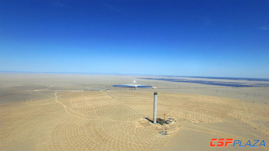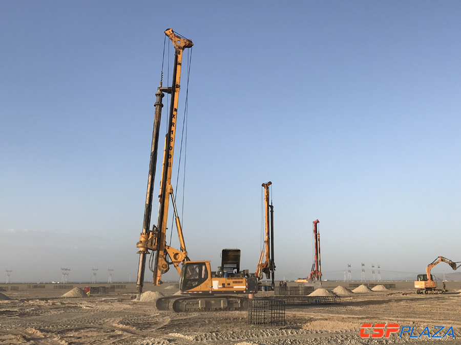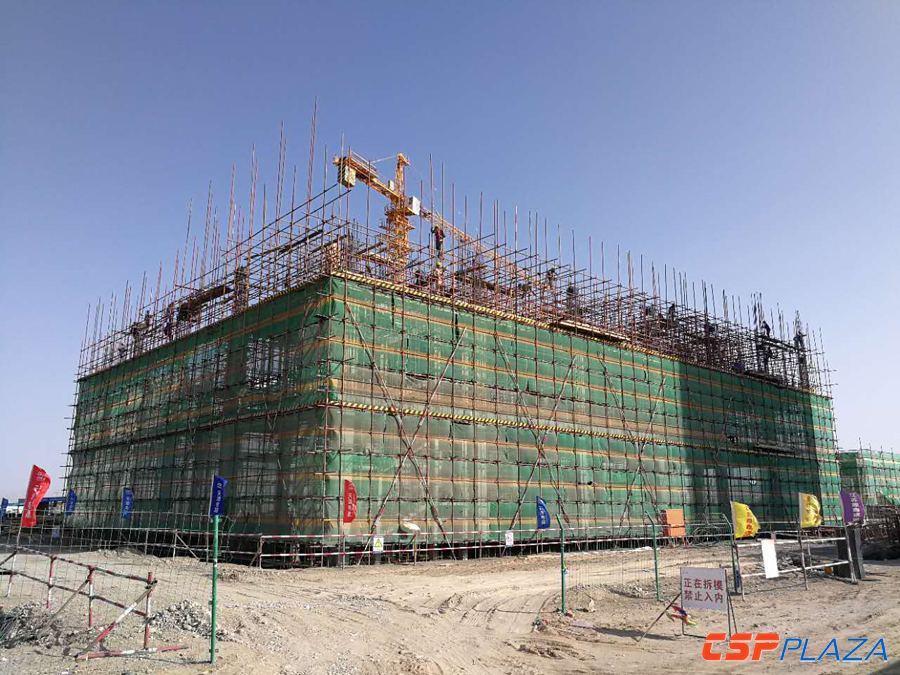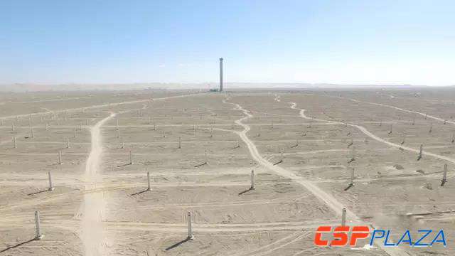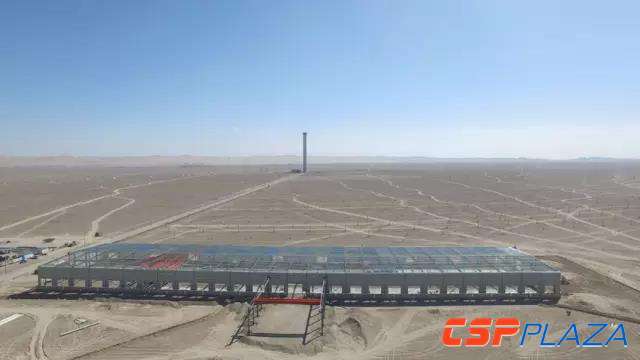作為首批光熱發(fā)電示范項(xiàng)目的建設(shè)基地之一,該電站有全球單機(jī)最大的聚光集熱鏡場(chǎng),共一萬(wàn)余臺(tái)定日鏡。截止目前,已完成定日鏡基礎(chǔ)8000多個(gè),定日鏡立柱開(kāi)始安裝,且定日鏡組裝車(chē)間完成封頂。