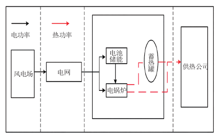 利用棄風(fēng)電量進(jìn)行電供熱是解決“三北”地區(qū)風(fēng)問題的有效手段。夜間負(fù)荷低谷時段,利用谷電電或者協(xié)定的棄風(fēng)電價對蓄熱式電鍋爐加熱,一方面向熱管網(wǎng)提供熱負(fù)荷,另一方面將多余熱能儲存至蓄罐中,以滿足次日電價高峰期的熱負(fù)荷要求。然而電爐的功率調(diào)節(jié)系統(tǒng)受機(jī)械部件制約,調(diào)節(jié)速率與風(fēng)功快速波動不匹配,無法實現(xiàn)最大限度的消納風(fēng)電。電學(xué)儲能具有電能雙向流動,有功、無功的靈活調(diào)節(jié)等點(diǎn),其協(xié)調(diào)電鍋爐能夠改善其調(diào)節(jié)靈活性,具備跟蹤風(fēng)功率的能力,提高風(fēng)電供熱的經(jīng)濟(jì)性。