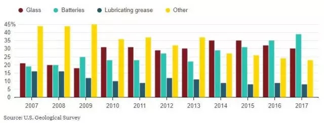鋰只是在近幾年才開(kāi)始在可充電電池中廣泛使用,在2015年之前,玻璃工業(yè)一直是鋰的最大消費(fèi)領(lǐng)域,目前鋰消費(fèi)領(lǐng)域主要是在可充電電池領(lǐng)域,然后是玻璃工業(yè),其次是潤(rùn)滑油工業(yè)。