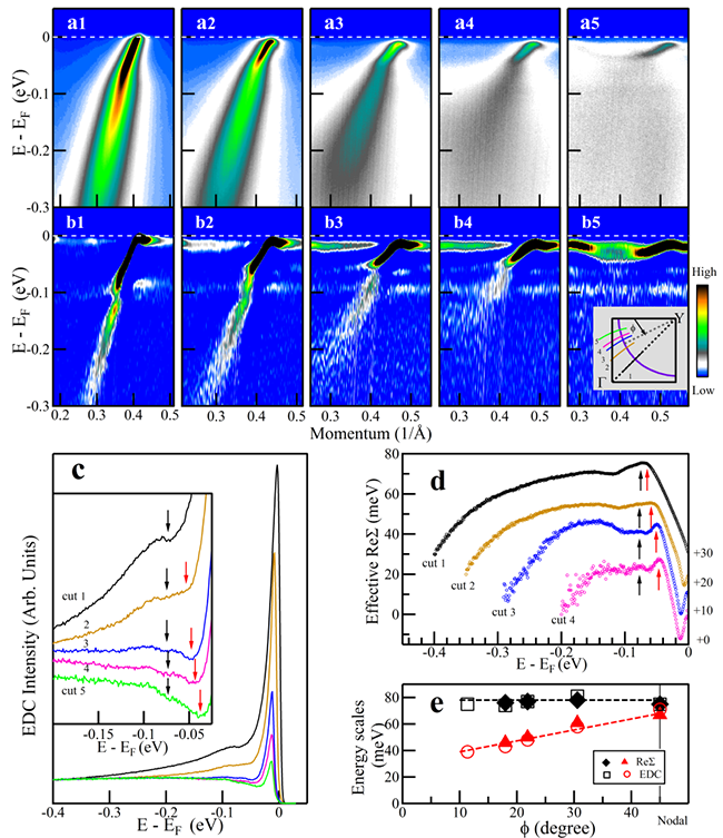 中國儲能網(wǎng)訊:銅氧化物高溫超導體中的多體相互作用的研究,尤其是電子與玻色子之間的耦合,對理解高溫超導電性和奇異“正常態(tài)”性質(zhì)的產(chǎn)生具有重要意義。其中最著名的莫過于沿節(jié)點方向~70meV能帶扭折(Kink)和在反節(jié)點區(qū)域~40meV能帶扭折的發(fā)現(xiàn)。對節(jié)點和反節(jié)點能帶扭折的起源(磁起源,聲子起源等) 已有眾多的工作進行了探索,但還沒有達成共識。此外,另一個長期存在的公開的問題,在于節(jié)點能帶扭折和反節(jié)點能帶扭折之間的關(guān)系。具體地講,就是動量空間中節(jié)點方向~70meV的能帶扭折如何隨動量演變到反節(jié)點區(qū)域~40meV的能帶扭折。