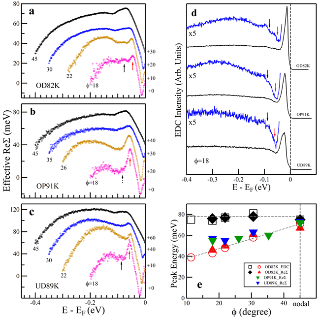此項研究第一次發(fā)現(xiàn)了在超導態(tài)兩個耦合模式在動量空間中大范圍共存,直接從實驗上解決了長期以來存在的有關(guān)~70meV節(jié)點能帶扭折如何演變到~40meV反節(jié)點能帶扭折的問題。同時,這兩個耦合模式的動量依賴關(guān)系異常,不能簡單地被已有的理論所解釋,對高溫超導體中電子-玻色子耦合的理論研究提出了新的問題和挑戰(zhàn)。在超導態(tài)觀察到電子與這兩個模式的強烈耦合,表明在研究高溫超導機理時,必須考慮它們對導致電子配對可能發(fā)揮的重要作用。該研究結(jié)果發(fā)表在近期的《物理評論快報》上【Phys. Rev. Lett. 111 (2013)107005】。