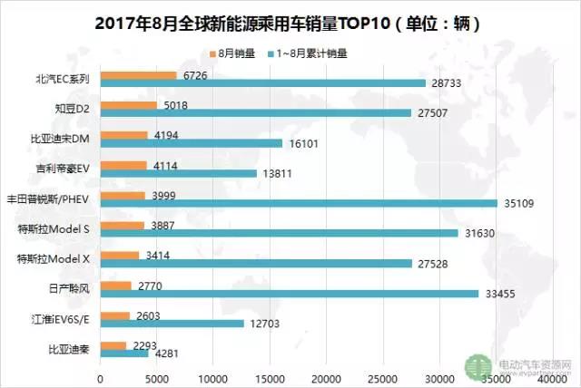 從上圖我們可以發(fā)現(xiàn),2017年8月全球新能源乘用車車企銷量排行中,前兩位均為自主品牌,在TOP10中,自主品牌就占有5席,整體來(lái)說(shuō),算不錯(cuò)的成績(jī)。