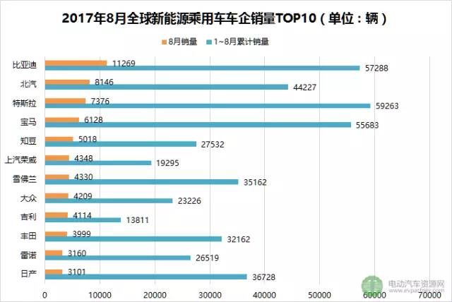 2017年1-8月全球新能源乘用累計(jì)銷量排在前十的車企分別為:特斯拉(59263臺(tái))、比亞迪(57288臺(tái))、寶馬(55683臺(tái))、北汽(44227臺(tái))、日產(chǎn)(36728臺(tái))、雪佛蘭(35162臺(tái))、豐田(32162臺(tái))、知豆(27532臺(tái))、雷諾(26519臺(tái))、大眾(23226臺(tái))。