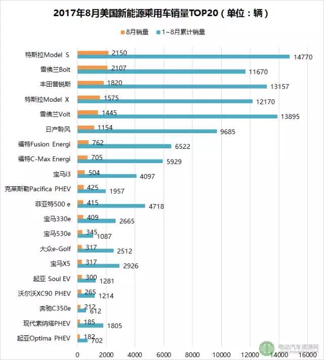 2017年8月美國(guó)新能源乘用車銷量排行中,特斯拉Model S奪得了冠軍,8月交付2150臺(tái);雪佛蘭Bolt銷售了2107臺(tái),排在第二位;排在第三的是豐田普銳斯,8月銷售1820臺(tái)。