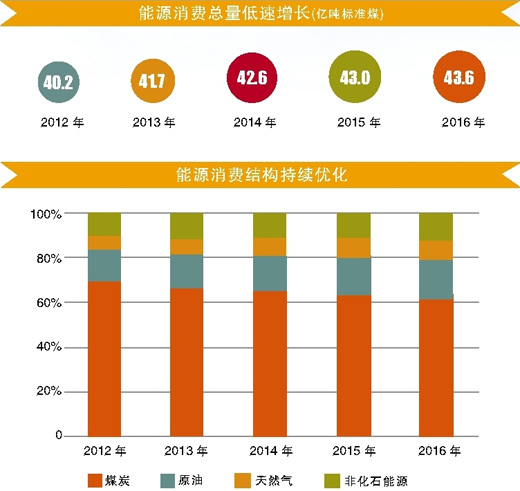 五年回首,能源生產(chǎn)轉(zhuǎn)型升級,消費(fèi)革命生生不息。2016年,全國能源消費(fèi)總量為43.6億噸標(biāo)準(zhǔn)煤,其中,煤炭消費(fèi)比2012年下降6.5個百分點(diǎn);清潔能源消費(fèi)(含天然氣)比重達(dá)到19.7%,比2012年提高5.2個百分點(diǎn)。電源和電網(wǎng)建設(shè)蹄疾步穩(wěn)、煤電超低排放改造啟動實(shí)施、非化石能源投資與日俱增、天然氣供應(yīng)不斷擴(kuò)大……高能效、低污染的清潔能源消費(fèi)比重節(jié)節(jié)攀升,能源消費(fèi)品種結(jié)構(gòu)持續(xù)優(yōu)化。
