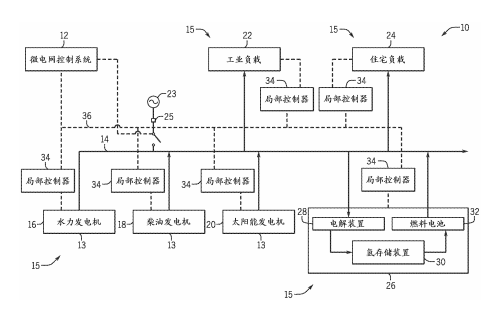 另外,微電網(wǎng)系統(tǒng)10內(nèi)的一個(gè)或多個(gè)存儲(chǔ)設(shè)備26可經(jīng)由傳輸線14從發(fā)電源13抽取功率。存儲(chǔ)設(shè)備26可用于存儲(chǔ)由發(fā)電源13(例如,水力發(fā)電機(jī)16、柴油發(fā)電機(jī)18或太陽能發(fā)電機(jī)20)生成的功率,并且這種存儲(chǔ)功率可在需要功率但并不容易獲得時(shí)(例如在斷電期間,在存在超額需求時(shí),等等)使用。在圖示的實(shí)施例中,存儲(chǔ)設(shè)備26包含電解裝置28、氫存儲(chǔ)裝置30和一個(gè)或多個(gè)燃料電池32(例如,燃料模塊、燃料堆等)。電解裝置28可使用生成的功率(例如,電力)來生成氫并且創(chuàng)建副產(chǎn)品,例如熱和氧。生成的氫可被壓縮并且存儲(chǔ)在氫存儲(chǔ)裝置30內(nèi),并且可被燃料電池32用于在任何時(shí)間生成電力。燃料電池32可用于在期望時(shí)經(jīng)由傳輸線14向微電網(wǎng)10供應(yīng)功率。在其他實(shí)施例中,存儲(chǔ)設(shè)備26可以是作為一個(gè)或多個(gè)能量存儲(chǔ)系統(tǒng)的部分而存在的一個(gè)或多個(gè)電池或其他能量存儲(chǔ)設(shè)備/資產(chǎn)。