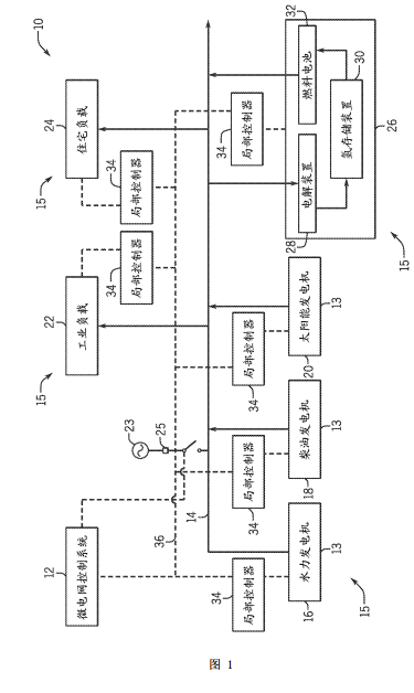 在圖示的實(shí)施例中,微電網(wǎng)10可包含各種功率發(fā)電機(jī)源13,比如例如水力發(fā)電機(jī)16、柴油發(fā)電機(jī)18和太陽能發(fā)電機(jī)20。在其他實(shí)施例中,微電網(wǎng)10可包含其他形式的可分派、不可分派或可再生發(fā)電源,比如例如組合熱和功率發(fā)電機(jī)或風(fēng)力渦輪機(jī)。由這些發(fā)電源產(chǎn)生的功率可經(jīng)由傳輸線14輸送給微電網(wǎng)10內(nèi)的負(fù)載。例如,在圖示的實(shí)施例中,由水力發(fā)電機(jī)16、柴油發(fā)電機(jī)18和/或太陽能發(fā)電機(jī)20產(chǎn)生的功率可經(jīng)由傳輸線14輸送給工業(yè)負(fù)載22或住宅負(fù)載24。在其他實(shí)施例中,產(chǎn)生的功率可經(jīng)由傳輸線14輸送給其他負(fù)載,例如市政當(dāng)局(例如,一個(gè)或多個(gè)房子、住宅區(qū)域、建筑、城市等)、車輛充電系統(tǒng)和/或商業(yè)設(shè)施(例如,一個(gè)或多個(gè)商店、制造廠、商業(yè)區(qū)等)。在某些實(shí)施例中,微電網(wǎng)10可在共同耦合25(例如,PCC 25)的點(diǎn)處通過斷路器耦合于主電網(wǎng)23(例如,公用事業(yè))。