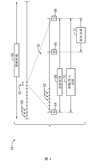 在整個(gè)時(shí)間步61(例如,在AB時(shí)間窗口和BC時(shí)間窗口兩者中連續(xù)地)中,微電網(wǎng)控制系統(tǒng)12從微電網(wǎng)資產(chǎn)15讀取信息并且在讀取/寫入過程70中將命令/指令寫入微電網(wǎng)資產(chǎn)15。讀取/寫入過程70可在時(shí)間間隔62內(nèi)發(fā)生,例如以每10秒、20秒、30秒等等。特別地,在時(shí)間點(diǎn)B 66處,在AB時(shí)間窗口期間收集的信息或數(shù)據(jù)(例如,從微電網(wǎng)資產(chǎn)15讀取的信息)被鎖存并且可形成數(shù)據(jù)文件并將其存儲(chǔ)在存儲(chǔ)器組件50內(nèi)。該數(shù)據(jù)文件可被微電網(wǎng)控制系統(tǒng)12使用,并且更具體地,通過運(yùn)行微電網(wǎng)優(yōu)化程序代碼的處理器46訪問,以在優(yōu)化分派過程71期間在BC時(shí)間窗口中計(jì)算微電網(wǎng)優(yōu)化調(diào)度。對(duì)優(yōu)化問題的最優(yōu)解決方案可在時(shí)間點(diǎn)C68處結(jié)束,并且優(yōu)化分派調(diào)度(例如,指令、命令或決策)經(jīng)由通信路徑36而與微電網(wǎng)資產(chǎn)15通信。采用該方式,新的命令將每幾秒(例如,10秒)與微電網(wǎng)資產(chǎn)15通信直到通過處理器46生成新的優(yōu)化問題并且在下一個(gè)時(shí)間步61內(nèi)對(duì)其求解。簡而言之,在某些實(shí)施例中,微電網(wǎng)控制系統(tǒng)12包含兩個(gè)相對(duì)快和慢的過程:每幾秒(例如,10秒)出現(xiàn)的快速讀取/寫入過程70,和在時(shí)間步61內(nèi)每幾分鐘/小時(shí)(例如,12分鐘)出現(xiàn)的慢優(yōu)化問題。如在圖4中圖示的,讀取/寫入過程70和優(yōu)化分派過程71兩者都在當(dāng)前時(shí)間步61內(nèi)的相同時(shí)間窗口(例如,時(shí)間窗口BC)內(nèi)出現(xiàn)。然而,在某些實(shí)施例中,在時(shí)間點(diǎn)C 68處傳送的優(yōu)化分派調(diào)度僅基于在時(shí)間點(diǎn)B 66處被收集并且存儲(chǔ)到數(shù)據(jù)文件中的鎖存數(shù)據(jù)。