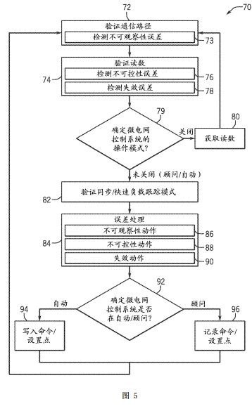 除不可控性類型II誤差外,控制系統(tǒng)12還可處理檢測(cè)的不可控性類型III誤差。如上文指出的,處理誤差可包含由微電網(wǎng)控制系統(tǒng)12采取來校正和/或考慮檢測(cè)的誤差的動(dòng)作或響應(yīng)。不可控性類型III誤差應(yīng)于操作模式不可控性并且可對(duì)在線發(fā)電設(shè)備或存儲(chǔ)設(shè)備26檢查。由于該誤差的危急程度,控制系統(tǒng)12可在檢測(cè)到該類型的誤差時(shí)立即轉(zhuǎn)移到顧問模式和/或關(guān)閉模式。如上文指出的,在某些實(shí)施例中,同步/快速負(fù)載跟蹤模式由控制系統(tǒng)12驗(yàn)證(框82)。在某些實(shí)施例中,如果在控制系統(tǒng)12所發(fā)送的東西與從微電網(wǎng)系統(tǒng)10所讀取的東西之間檢測(cè)到差異,控制系統(tǒng)12可未停留在自動(dòng)模式,并且可切換到顧問模式和/或關(guān)閉模式。