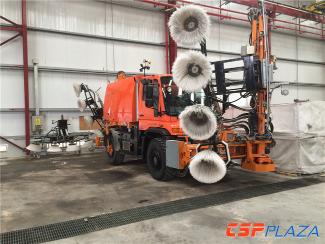 國(guó)際領(lǐng)先的反射鏡清洗裝置制造商Albatros曾設(shè)計(jì)出一款槽式和塔式電站均適用的水投射式清洗車(詳情可見(jiàn)下列視頻)。這種清洗車較為傳統(tǒng),采用人工駕駛噴水清洗的方案。相對(duì)而言,槽式鏡的清洗難度要大些,需要控制好上下兩把刷子的角度,此方法比較耗費(fèi)水資源。據(jù)了解,類似的清洗車車身自備水箱,清洗篩帶遠(yuǎn)紅外智能控制設(shè)備。