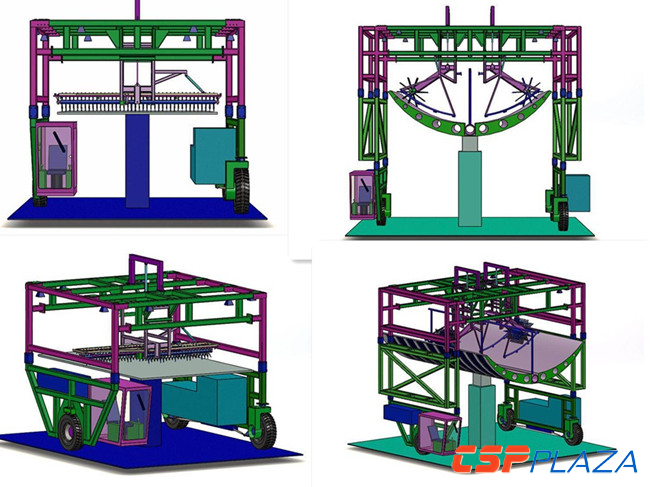 此外,國(guó)內(nèi)清洗車供應(yīng)商寧波跨越太陽(yáng)能板清洗車有限公司開發(fā)了一款可應(yīng)用于塔式和槽式光熱電站的跨越式清洗車輛,采用高壓柔條刷滾水洗、高壓吹風(fēng)和高壓除塵三種組合方式,具有整機(jī)結(jié)構(gòu)簡(jiǎn)單、操作控制方便、晃動(dòng)損傷減輕、運(yùn)行平穩(wěn)高效、轉(zhuǎn)彎靈活方便及場(chǎng)地利用率高的特點(diǎn),同時(shí),該公司還自主研發(fā)了適用于沙漠等軟土地面的履帶式龍門清洗車。此外,針對(duì)西北地區(qū)寒冷條件下鏡面易結(jié)冰的現(xiàn)象,其還提出了采用暖風(fēng)吹塵干洗的措施。(如下圖所示)