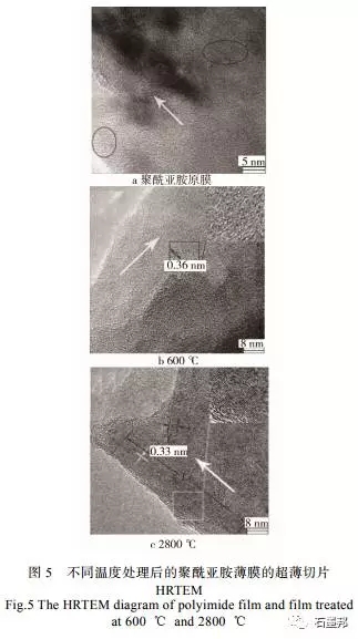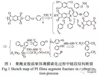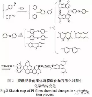 聚合物結(jié)構(gòu)演變?cè)诘蜏責(zé)峤饽さ倪^程首先進(jìn)行鏈段結(jié)構(gòu)斷裂和熱交聯(lián)反應(yīng),熱交聯(lián)反應(yīng)實(shí)現(xiàn)聚酰亞胺結(jié)構(gòu)重整。經(jīng)過多次試驗(yàn)分析發(fā)現(xiàn),聚酰亞胺結(jié)構(gòu)重整發(fā)生在550~700℃,此時(shí)聚酰亞胺 結(jié)構(gòu)中的亞胺環(huán)分解、醚鍵斷裂,生成的自由基發(fā)生熱交聯(lián)反應(yīng)形成穩(wěn)定的立體結(jié)構(gòu)。石墨邦 www.shimobang.cn —國(guó)內(nèi)首家碳石墨電商平臺(tái) 酰亞胺環(huán)的分解與醚鍵的斷裂造成結(jié)構(gòu)重排,形成交聯(lián)結(jié)構(gòu),由線性結(jié)構(gòu)逐步形成網(wǎng)絡(luò)結(jié)構(gòu)。逐漸形成六角碳環(huán)的多環(huán)芳環(huán)結(jié)構(gòu),進(jìn)一步稠環(huán)化轉(zhuǎn)化成平面網(wǎng)狀結(jié)構(gòu),形成碳微晶,進(jìn)而無序堆積成類石墨烯結(jié)構(gòu)。