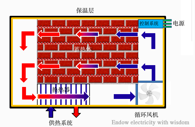 九洲電氣的固體蓄熱電鍋爐以高熱容材質(zhì)做蓄能組件,用隔熱耐火材料絕熱保溫,是一種高效、經(jīng)濟、節(jié)能、安全可靠、減少環(huán)境污染的新型電加熱設(shè)備,根據(jù)需求分為高壓型和低壓型。利用它將夜間低谷電的電能轉(zhuǎn)化成熱能儲存起來,用于白天高峰電時,采暖或供熱水使用,從而降低了用電費用。它在夜間,當電力需求小的時候,蓄能組件通過電阻加熱系統(tǒng)被 加熱到 800°C左右,把電能轉(zhuǎn)換成熱能儲存起來,到了白天用電高峰期間,則通過送風系統(tǒng),向儲能裝置內(nèi)送入空氣,經(jīng)過溫度調(diào)節(jié)向用戶供給熱風,或用熱風將水加熱供給用戶。