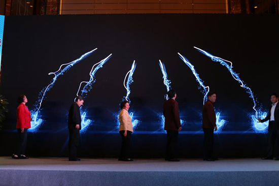 致辭結束后,原安徽省副省長宋明、中科院物質研究院專家馮士芬、原安徽省能源局總工錢立家、安徽省電力設計院新能源公司總經理蔣克勇、合肥聚能新能源科技有限公司副總裁周昌進、合肥聚能新能源科技有限公司副總裁盧琳上臺,共同啟動聚能·百姓+家用儲能光伏系統(tǒng)