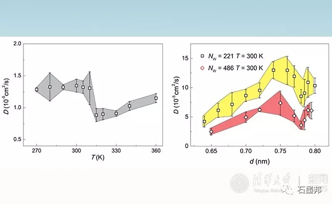 徐志平研究組通過分子模擬技術(shù)研究了石墨烯和氧化石墨烯層間受限水插層的自擴(kuò)散與集體擴(kuò)散行為。論文研究指出,由于納米尺度的空間限制,水分子的團(tuán)簇具有層狀結(jié)構(gòu);而當(dāng)水分子受限于具有晶體結(jié)構(gòu)的石墨烯壁間時,甚至?xí)谑覝匦纬梢欢ǖ木w結(jié)構(gòu),即二維冰。與流體相比,固體具有一定的剪切剛度,且水分子在其中難以擴(kuò)散,因此處于石墨烯層間的納米空間受限水自擴(kuò)散系數(shù)要低于體相水;然而由于石墨烯壁面極低的摩擦系數(shù),水分子的團(tuán)簇可以在石墨層間實(shí)現(xiàn)較體相水自擴(kuò)散快得多的集體擴(kuò)散,其擴(kuò)散系數(shù)隨團(tuán)簇尺寸的減小增加,且隨溫度升高而增大,這是其熱激活擴(kuò)散機(jī)制的體現(xiàn)。