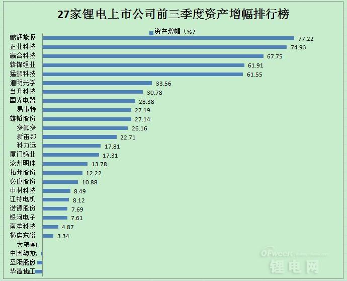 從2016年9月底到2017年9月底,鋰電上市公司的資產(chǎn)收入增長比較緩慢,27家企業(yè)的總資產(chǎn)增長平均為23.96%,其中有4家公司實現(xiàn)資產(chǎn)負增長。