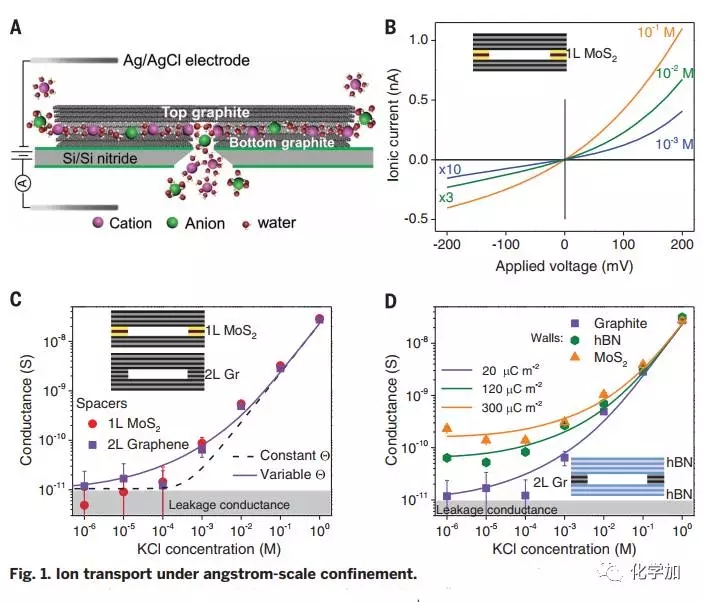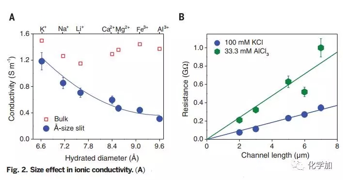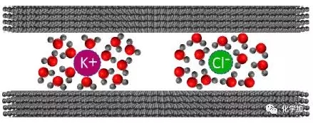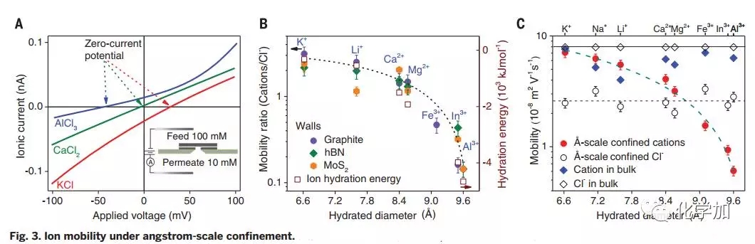 來自英國、中國的科研團隊通過調(diào)控分子間范德華作用力,組裝得到具有原子級別光滑表面的石墨烯通道,僅兩層石墨烯厚度不同于準一維納米管和生物通道,這種二維納米通道化學(xué)穩(wěn)定性良好,其高度潔凈表面使得通道表面電荷密度較此前文獻報道值低3-4個數(shù)量級,可以阻隔水合直徑>13 ?的離子,這可以通過位阻效應(yīng)予以解釋。