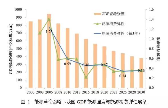 根據(jù)能源革命戰(zhàn)略提出的發(fā)展目標(biāo),結(jié)合我國(guó)的經(jīng)濟(jì)發(fā)展展望(見(jiàn)《中國(guó)能源革命戰(zhàn)略如何助力全球氣候變化治理》)測(cè)算了我國(guó)GDP能源強(qiáng)度以及能源消費(fèi)彈性的變化趨勢(shì)(如圖1所示)。據(jù)分析,GDP能源強(qiáng)度的變化趨勢(shì)與歷史發(fā)展軌跡是一致的,一直保持穩(wěn)步下降的趨勢(shì)。從絕對(duì)量來(lái)看,2030年我國(guó)GDP能源強(qiáng)度約為381千克標(biāo)煤/萬(wàn)元(2015年不變價(jià)格,下同),相比2005下降了約60%,單位GDP能源強(qiáng)度明顯降低。