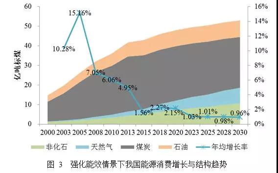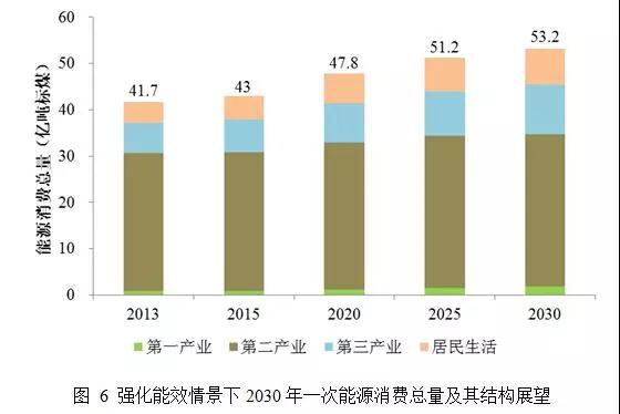 綜上分析,我國(guó)2020年一次能源消費(fèi)總量約48億噸標(biāo)煤,2030年一次能源消費(fèi)總量可控制在53億噸標(biāo)煤左右(圖6)。這也就表明,能效情景是具備較大可行性的。