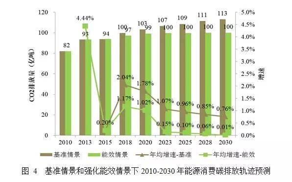 基準(zhǔn)情景中,我國(guó)能源消費(fèi)二氧化碳排放量一直處于增長(zhǎng)態(tài)勢(shì),“十三五”期間,能源消費(fèi)二氧化碳排放量?jī)粼鲩L(zhǎng)約9億噸,2020-2030年凈增長(zhǎng)約10億噸,從二氧化碳排放量的年均增速來(lái)看,“十三五”期間,年均增速接近2%,2020年之后二氧化碳排放量年均增速約0.92%。能效情景中,我國(guó)能源消費(fèi)二氧化碳排放量增長(zhǎng)速度明顯小于基準(zhǔn)情景,尤其是2023年以后,二氧化碳排放量幾乎接近零增長(zhǎng),年均增長(zhǎng)率可在0.1%左右。從絕對(duì)量上來(lái)看,能效情景中二氧化碳排放量要顯著少于基準(zhǔn)情景,2020年減排放4億噸,2030年減排13億噸,能夠更好地履行2030年二氧化碳排放總量盡早達(dá)峰的目標(biāo)(圖4)。