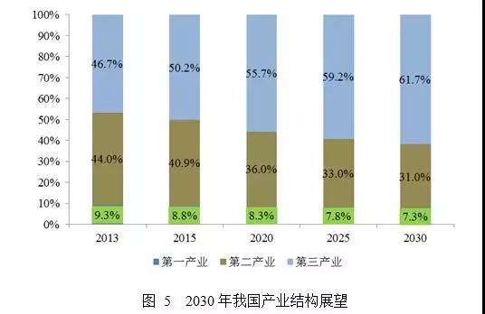 那么,能效情景僅是一個(gè)情景描述嗎?有沒(méi)有潛在可達(dá)性?為了回答這個(gè)問(wèn)題,本文進(jìn)一步研究了我國(guó)經(jīng)濟(jì)結(jié)構(gòu)調(diào)整的趨勢(shì)以及各產(chǎn)業(yè)能源消費(fèi)強(qiáng)度下降的潛力。首先,,基于歷史數(shù)據(jù)以及已有研究成果對(duì)我國(guó)2030年產(chǎn)業(yè)結(jié)構(gòu)的優(yōu)化情況進(jìn)行了展望(見(jiàn)圖5)。預(yù)計(jì)到2030年,我國(guó)第二產(chǎn)業(yè)占GDP的比重將下降到31%左右,而第三產(chǎn)業(yè)的比重將逐步上升到61.7%左右。
