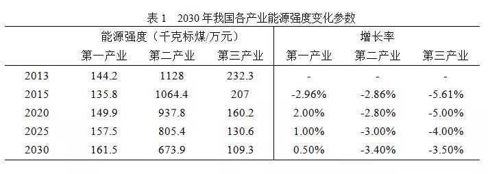 在此基礎(chǔ)上,本文設(shè)計(jì)了到2030年各產(chǎn)業(yè)能源強(qiáng)度的變化路徑(表1)??傮w來(lái)講,現(xiàn)代農(nóng)業(yè)的發(fā)展將消耗更多的能源,也就意味著第一產(chǎn)業(yè)的能源強(qiáng)度水平將有小幅上升;內(nèi)部結(jié)構(gòu)優(yōu)化與技術(shù)提升將導(dǎo)致第二產(chǎn)業(yè)未來(lái)的能源強(qiáng)度保持持續(xù)下降趨勢(shì);而第三產(chǎn)業(yè)能源強(qiáng)度在歷史趨勢(shì)上減速下降。