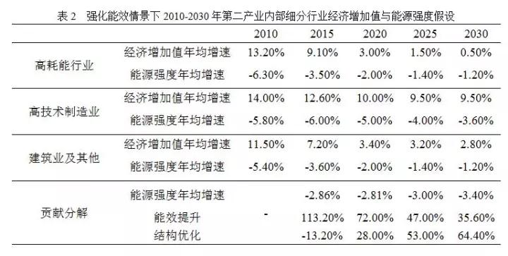 首先,根據(jù)歷史發(fā)展數(shù)據(jù)對(duì)三類行業(yè)經(jīng)濟(jì)增加值的變化趨勢(shì)進(jìn)行初步判斷與參數(shù)設(shè)定,進(jìn)而得到2030年第二產(chǎn)業(yè)內(nèi)部結(jié)構(gòu)的變化趨勢(shì)。對(duì)于三類行業(yè)能源強(qiáng)度的下降趨勢(shì)基于以下判斷:高耗能行業(yè)與建筑業(yè)及其他行業(yè)的生產(chǎn)技術(shù)相對(duì)成熟,能效改善空間不大,能效改進(jìn)空間主要關(guān)注的是高技術(shù)制造業(yè)?;谝陨霞僭O(shè)及判斷,本文對(duì)三類行業(yè)的經(jīng)濟(jì)增加值與能源強(qiáng)度的變化趨勢(shì)分別進(jìn)行了參數(shù)設(shè)定(如表2)。結(jié)果顯示,“十三五”期間,第二產(chǎn)業(yè)能源強(qiáng)度年均下降2.81%,其中有72%的貢獻(xiàn)源自技術(shù)進(jìn)步。但是2020到2030年間,第二產(chǎn)業(yè)能源強(qiáng)度的主要驅(qū)動(dòng)力是結(jié)構(gòu)優(yōu)化,貢獻(xiàn)率超過(guò)60%。