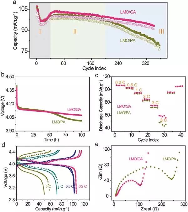 (e) LMO/PA 和LMO/GA電池的電化學阻抗分析。