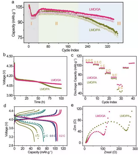 (e) LMO/PA 和LMO/GA電池的電化學(xué)阻抗分析。