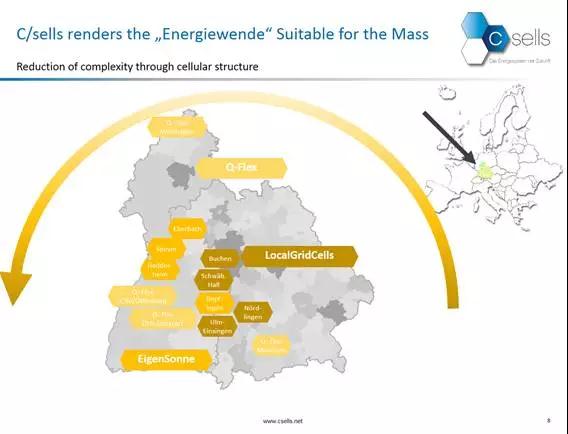 “C-sells”的目標是通過數(shù)字化基礎(chǔ)設(shè)施(發(fā)電、配電、儲能、地產(chǎn))實現(xiàn)分散結(jié)構(gòu)的大規(guī)模生產(chǎn),從而實現(xiàn)生態(tài)進步和經(jīng)濟附加值。C-sell項目選址在德國南部的巴伐利亞州、巴登 - 符騰堡州和黑森州,覆蓋了德國重要的工業(yè)負荷中心如斯圖加特、萊茵-內(nèi)卡區(qū)域、大慕尼黑地區(qū),涵蓋2602個城鎮(zhèn),3000萬人口,80萬個能源用戶。目前,核電是該地區(qū)的能源供應(yīng)的重要來源之一,約占30%。但是,根據(jù)德國政府的計劃,要在2022年前關(guān)閉德國全部核反應(yīng)堆。所以在這片區(qū)域內(nèi),如何將太陽能、生物質(zhì)能和水力等清潔能源納入到現(xiàn)有的能源系統(tǒng)中,是一個重要的課題。